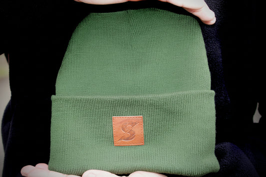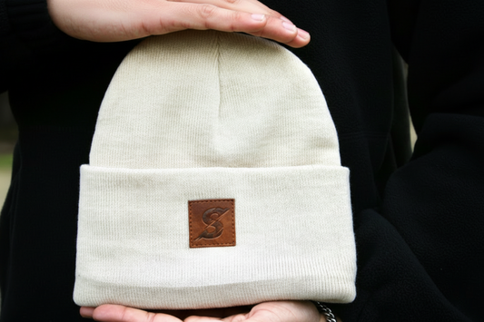 Sculpture Signature Leather Patch Beige Beanie Hat
